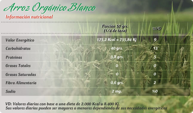 Arroz Orgánico BRILLANTE ha sido cultivado en forma natural sin la utilización de insecticidas, herbicidas y funguicidas, ni fertilizantes químicos; en campos orgánicos certificados. Asegurando la producción de un alimentos saludable y la conservación del medio ambiente.